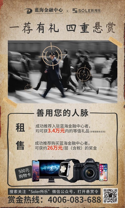 從2019年1月1日起,成功推薦朋友購買藍海金融中心寫字樓,最高可獲得¥260000元/層(含稅)的獎金。